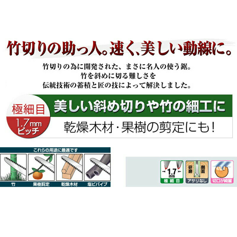 刃長:270mm ピッチ:1.7mm竹切りの為に開発された、まさに名人の使う鋸!