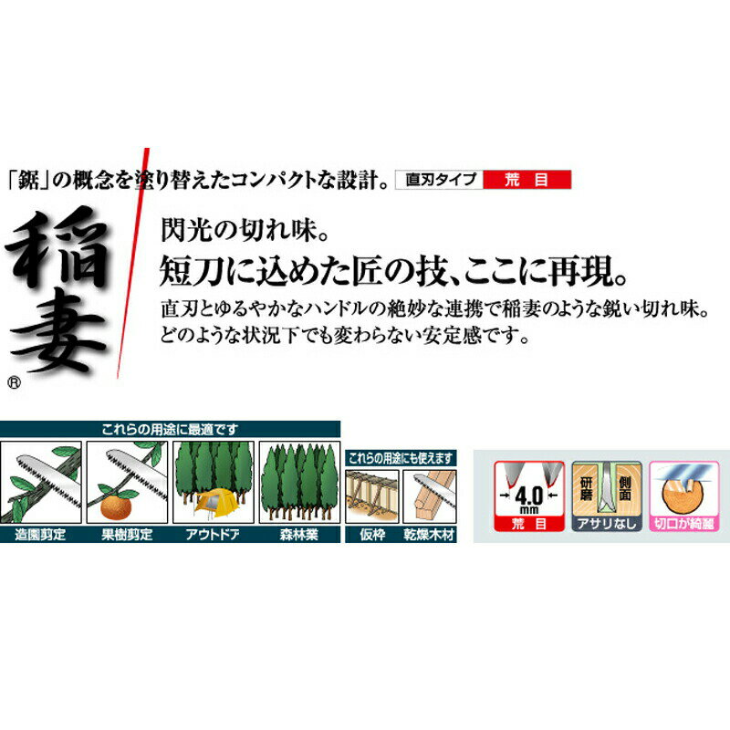 山林での枝打ち作業、植木や果樹の剪定作業、 仮枠作りや卓上での木工作業など鋸は様々な状況で使われますが、 直刃鋸はそのまっすぐな刃並びで、どのような状況下でも扱いやすく、 安定した切れ味を発揮し、精度の求められる作業に最適です。
