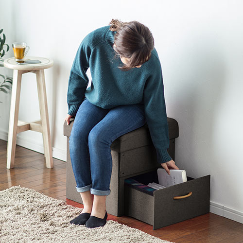 <関連キーワード>収納スツール,折りたたみ,引き出し付き,2層構造,ファブリック,オットマン,北欧,ベンチ,耐荷重100kg,ブラウン